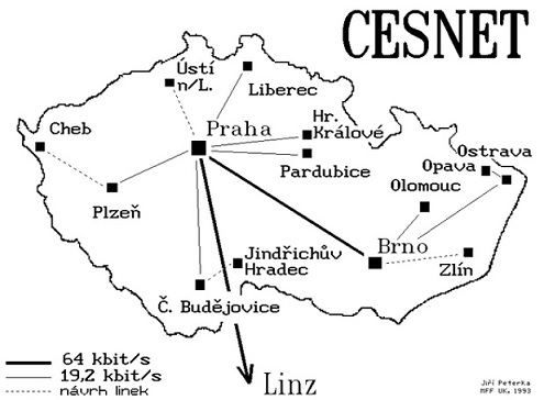 1993 15. června vzniká celorepubliková páteřní sít CESNET, zpočátku se dvěma středy v Praze a Brně propojenými pevnou linkou o kapacitě 64 Kb/s. Síť provozuje ČVUT v Praze.