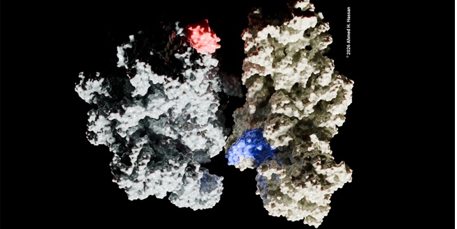 Model sestavování ribozomu s objevenými faktory (červeně a modře), které podporují jeho vznik v nepřítomnosti RimM | Foto: Ahmed H. Hassan, CEITEC