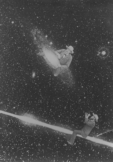 na galaxii M31“ (nahoře) a prvním ředitelem hvězdárny profesorem Františkem Nušlem „sedícím na bolidu“ (dole). Zdroj: archiv Astronomického ústavu AV ČR, autor neznámý.