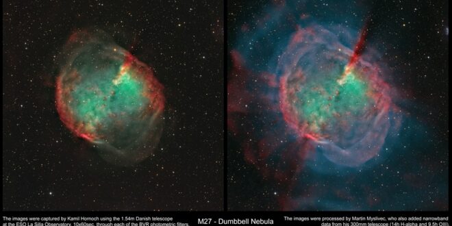 Popis: 3x10x60 sec, BVR filtry, 1,54 m Dánský dalekohled na observatoři La Silla v Chile. Jemná dekonvoluce, barevná kalibrace, jemná retuš. Doplněno o úzkopásmová data (H-alfa: 14 hod a OIII: 9,5 hod), které do snímku doplňují slabé vnější obálky – 300 mm Newton, Běleč nad Orlicí