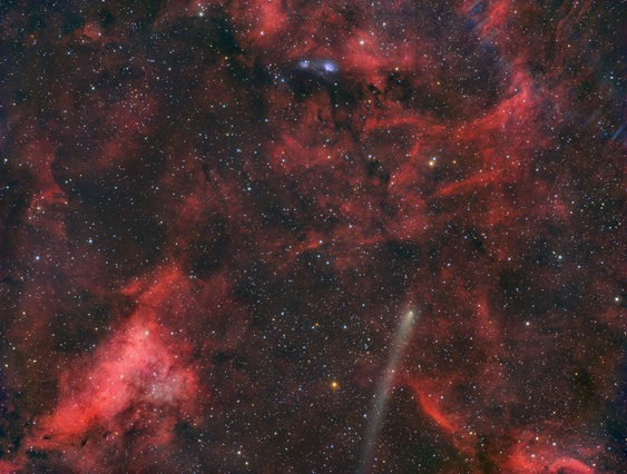 Ovšem nejen kometa je na snímku zobrazena. Na pozadí vodíkových načervenalých oblaků, které zde září díky ultrafialové emisi mladých, horkých a hmotných hvězd rozsáhlé asociace Cygnus OB2, svítí i namodralé prachové reflexní mlhoviny NGC 6914. Ty pro změnu rozsvěcuje modrá složka světla hvězd této hvězdné asociace, která se na prachových mračnech značně rozptyluje. Označení množného čísla je zde namístě, neboť se skládá z několika částí, které astronomové označují NGC 6914, NGC 6914a a NGC 6914b. Nebo také VdB 131 and VdB 132. To zase dle jiného katalogu. Samotné hvězdy této asociace jsou staré pouhých několik miliónů let a spolu s okolními mlhovinami leží od nás ve vzdálenosti asi 6000 světelných let.
