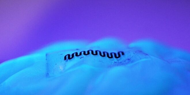 Složka z lithiových baterií mohla tvořit základ léčby bolesti nebo jiných poruch. Malá, pružná náplast, kterou lze připojit k nervové tkáni. Kredit: Chuanwang Yang