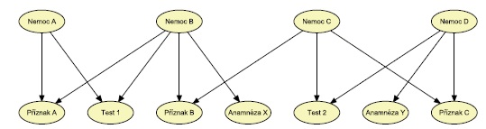 V případě úlohy hledání diagnózy jsou veličinami našeho zájmu veličiny odpovídající daným diagnózám a pozorovanými veličinami jsou například výsledky provedených vyšetření, laboratorních testů apod. První rozsáhlou bayesovskou sítí aplikovanou v oblasti lékařství je síť nazývaná QMR-DT, což je zkratka pro Quick Medical Reference – Decision Theoretic Version. QMR byla vyvinuta v devadesátých letech minulého století a slouží k diagnostice onemocnění, s nimiž se internisté setkávají nejčastěji. Model obsahuje diagnostické veličiny, jako jsou anamnézy, příznaky a výsledky laboratorních testů, a veličiny odpovídající více jak 750 různým nemocem.