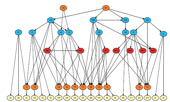 Vztahy mezi chorobami a příznaky jsou reprezentovány pomocí podmíněných pravděpodobností, které byly naučeny z dat amerického Národního centra pro zdravotnickou statistiku (National Center for Health Statistics). Struktura modelu odpovídá bipartitnímu grafu, v němž veličiny v horní vrstvě odpovídají nemocem a veličiny v dolní vrstvě odpovídají anamnézám, příznakům a výsledkům laboratorních testů. Model obsahuje pouze hrany vedoucí z veličin v horní vrstvě do souvisejících veličin v dolní vrstvě. V modelu nejsou žádné hrany mezi veličinami ve stejné vrstvě. To podle grafového kritéria pro podmíněnou nezávislost diskutovaného výše odpovídá předpokladu vzájemné nezávislosti anamnéz, příznaků a výsledků laboratorních testů při známé diagnóze. Obrázek 5 zobrazuje příklad struktury části QMR modelu.