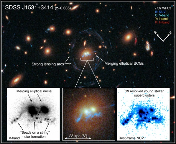 Pohled kamery Wide Field Camera 3 (WFC3) Hubbleova dalekohledu na kupu galaxií SDSS J1531+3414. Emise v blízkém UV (NUV), V pásmu, H pásmu a I pásmu jsou zobrazeny modře, tyrkysově, červeně a žlutě. Kupa se vyznačuje pozoruhodnými silnými čočkovými oblouky, četnými eliptickými a spirálními galaxiemi a splývajícími eliptickými nejjasnějšími kupami galaxií (BCG, brightest cluster galaxies). Tři vložené panely zleva doprava ukazují detailnější pohled na splývající eliptická jádra a hvězdné formace „korálků na šňůrce“ v pásmu V, BCG ve všech pásmech a 19 rozlišených mladých superhvězdokup v NUV. Kredit: arXiv (2023). DOI: 10.48550/arxiv.2312.06762