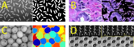 Obrázek 1: Ukázky segmentace obrazu: (A) prahování, (B) segmentace dle barev, (C) segmentace rozvodím, (D) segmentace dle textury