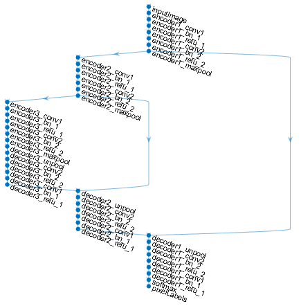 Efektivní sémantickou segmentaci snímků umožňuje speciální architektura hluboké neuronové sítě zvaná SegNet [1]. V MATLABu lze sítě SegNet vytvářet funkcí segnetLayers. SegNet je síť typu DAG a obsahuje několik skupin vrstev (obrázek 4). Každá skupina se skládá z vrstev Convolution2D, BatchNormalization, ReLU a MaxPooling2D nebo MaxUnpooling2D. Na vstupu sítě je vrstva ImageInput pro vstup obrázku a na výstupu sítě jsou vrstvy Softmax a PixelClassification pro přiřazení klasifikačních kategorií jednotlivým pixelům na snímku.