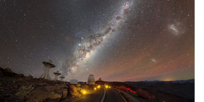 Na snímku je zachyceno hvězdné nebe na jižní zemské polokouli, kterému dominuje centrální část naší Galaxie (Mléčné dráhy) a dvě satelitní galaxie – Magellanova oblaka – vše nad observatoří ESO La Silla v Chile. Ve spodní části snímku se hlavní cesta táhne do zatáčky jakoby ve směru pod centrum Mléčné dráhy, pod nímž jsou vidět hned dvě kopule. Bližší patří 1,54 m Dánskému dalekohledu, který na dálku využívají také vědci z Astronomického ústavu AV ČR. V dáli – pod středem snímku – je pak kopule největšího dalekohledu observatoře, 3,6 m teleskopu, který se mj. zasloužil o objev extrasolární planety obíhající okolo Proximy v souhvězdí Kentaura, nejbližší hvězdy ke Slunci. Tři věže vlevo jsou základnami pro teleskopy BlackGEM, které v době pořízení snímku ještě nebyly nainstalovány. Jejich cílem je pátrání po optických protějšcích největších zdrojů gravitačních vln. Na obloze kromě centra Mléčné dráhy, nad nímž září jasný Jupiter, vidíme červenou zář vzduchu, tzv. airglow, okolí souhvězdí Jižního kříže (v horní části Mléčné dráhy) a také slabou záři tzv. zvířetníkového světla, která se táhne kolmo vzhůru.