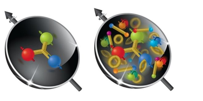 Protony a neutrony se skládají ze tří valenčních kvarků (na obrázku výše znázorněných jako větší barevné kuličky se šipkami), gluonů (žlutá vinutí ) a proměnlivého moře další kvarků/antikvarků (dvojice menších barevných kvarků a antikvarků na pravém obrázku). EIC bude zkoumat, jak tyto spiny kvarků a gluonů a jejich možný orbitální pohyb vytvářejí celkový spin protonu. Dosud provedené experimenty ukazují, že spin kvarků a gluonů může vysvětlit pouze asi 40-50 % celkového spinu protonu.