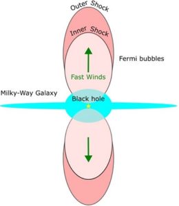 Rychlé větry proudící z centra Galaxie vytvářejí dopředný ráz a zpětný ráz. Ten druhý má být zodpovědný i za Fermiho bubliny. Credit: Tokyo Metropolitan University