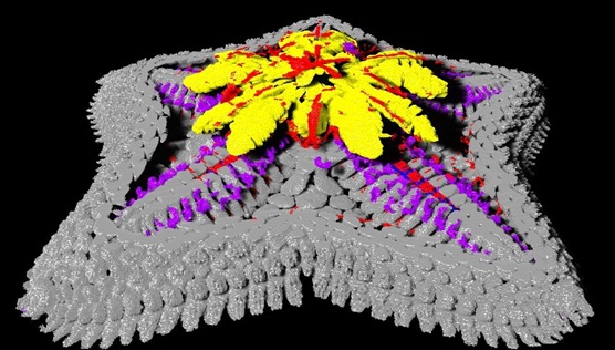 Mikro-CT sken mořské hvězdice zobrazující kostru (šedá), trávicí soustavu (žlutá), nervovou soustavu (modrá), svaly (červená) a cévní systém (fialová). Kredit: University of Southampton