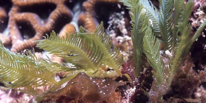 Na obrázku výše je Caulerpa sertularioides, také dlouhá jednobuněčná řasa lazucha, ale zřejmě jiný druh, než se jí.