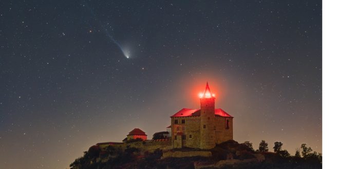 Kometa Olbers za hradem Kunětická hora. Snímek Fyzikálního ústavu v Opavě publikovala NASA