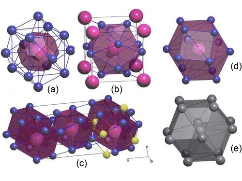 Geometrie v okolí atomů Cs u atomů Li ve sloučeninách (a) Li8Cs, (b) Li3Cs, (c) Li6Cs a (d) Li14Cs. Mnohostěny (polyedry) Cs jsou znázorněny červeně. Žluté atomy Li (c) označují další kontakty atomu Cs, které doplňují jeho koordinační číslo na 8 + 6 = 14. Viz (e), příslušný koordinační mnohostěn. Credit: Nano Letters