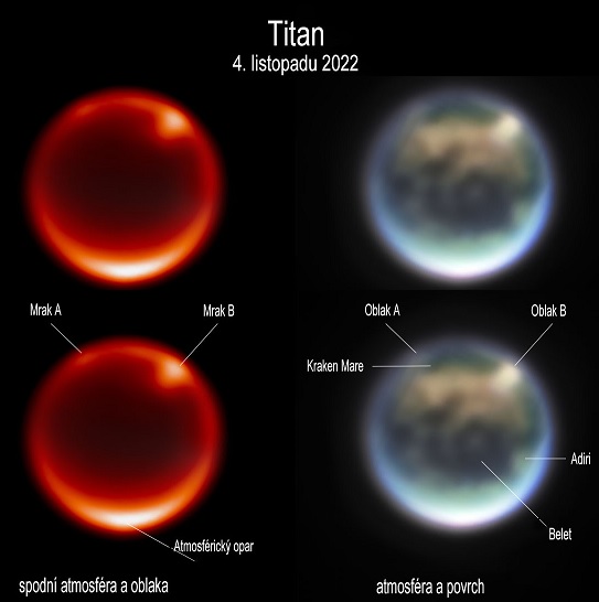 Snímky Saturnova měsíce Titanu pořízené 4. listopadu 2022 na JWST. Vlevo vidíme snímek s použitím filtru F212N, který je citlivý na spodní vrstvy atmosféry Titanu, o vlnové délce 2,12 mikrometru. Jasné skvrny jsou výrazné mraky na severní polokouli. Vpravo je barevný složený snímek s použitím kombinace několika filtrů kamery NIRCam. Modrá barva odpovídá filtru F140M (1,40 mikrometru), zelená je z filtru F150W (1,50 mikrometru), červená zase připadá filtru F200W (1,99 mikrometru), úroveň jasu udává filtr F210M (2,09 mikrometru). Na obrázku je popsáno několik výrazných povrchových prvků. Kraken Mare se považuje za metanové moře, Belet je tvořen tmavě zbarvenými písečnými dunami a Adiri je jasný albedový prvek. Zdroj: https://stsci-opo.org/. Překlad: Dušan Majer