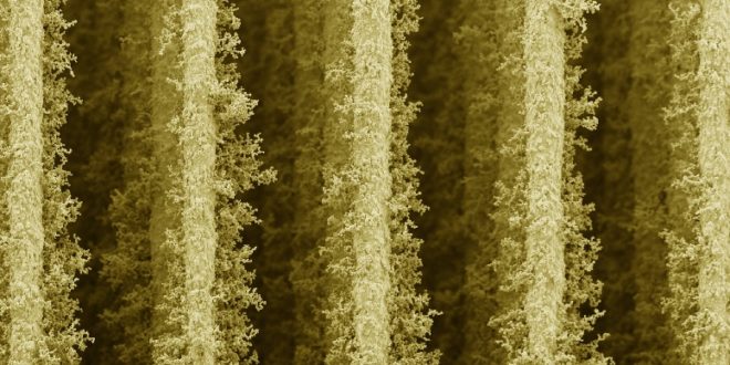 Poznámka PH: Při čtení tiskové zprávy jsem si kdovíproč vzpomněl na „město“ z románu Nepřemožitelný S. Lema (tam tedy nešlo o žádné nanoměřítko a celý „les“ fungoval na bázi anorganických materiálů; v době, kdy zde lidé přestáli, bylo město navíc už mrtvé ve smyslu nefungující).