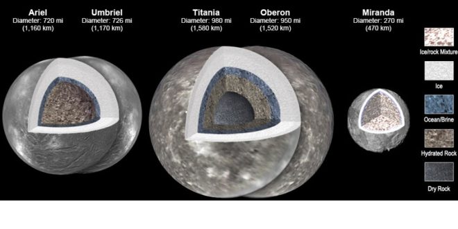 Opětovná analýza dat ze sond Voyager a nové počítačové modelování vedly vědce NASA k závěru, že čtyři z největších měsíců Uranu mají pravděpodobně mezi svým jádrem a ledovou kůrou vodní oceán, který v některých případech může být hluboký i desítky kilometrů. Nová studie podrobně popisuje vývoj složení a struktury vnitřku všech pěti velkých měsíců: Ariel, Umbriel, Titania, Oberon a Miranda. Celkem kolem Uranu krouží nejméně 27 měsíců.