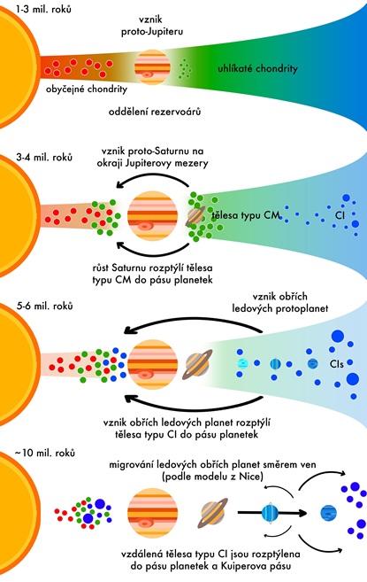 Klíčovým objevem bylo zjištění, že vzdálenosti implantovaných planetesimál „zrcadlí“ stav mlhoviny v okamžiku jejich příletu. Když byla hustota plynu velká, například na třech astronomických jednotkách, většina planetesimál byla zachycena právě v této vzdálenosti. To znamená, že odlišné vzdálenosti planetek CM a CI odpovídají rozdílným časům, tedy rozdílné fázi vývoje mlhoviny. Planetky typu CM přiletěly dříve, během formování planety Saturn, když byla mlhovina ještě hustá. Planetky typu CI přiletěly později, až po formování Uranu a Neptunu, když se mlhovina rozplývala.