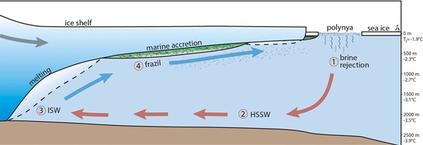 V roce 2019 vědci pomocí dálkově ovládaného robota Icefin pozorovali pumpování ledu v trhlině pod Rossovým šelfovým ledovcem v Antarktidě. Hladký a zakalený led u základny šelfu roztál a vytvořil čerstvější, méně hustou vodu, která stoupala vzhůru trhlinou a znovu zamrzala jako drsný, zelený mořský led. Proces je řízen tím, že bod tuhnutí vody nepřímo závisí na tlaku: S rostoucí hloubkou a tlakem musí být voda chladnější, aby se mohla rozpínat (led má nižší hustotu než kapalná fáze) a zmrznout. V hlubinách, kde je tlak vyšší a bod tuhnutí nižší, mohou oceánské proudy snadněji led rozpouštět. Pokud je roztátá ledová voda vztlaková a stoupá do menších hloubek a nižšího tlaku, opět zamrzá. Tento cyklus přerozděluje část ledu a mění jeho složení a strukturu.