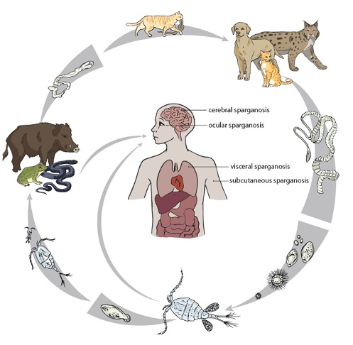 Schéma životního cyklu tasemnice Spirometra erinaceieuropaei. Dospělci tasemnice žijí ve střevě šelem (pes, kočka, rys), uvolňují vajíčka, která se s trusem dostávají do vody, kde se líhnou larvy (koracidia). Larvy jsou pozřeny buchankami (první mezihostitel), v jejichž těle dospívají do dalšího stádia (procerkoid), který je schopen infikovat téměř jakéhokoliv čtyřnohého obratlovce, jako jsou žáby, hadi či divočáci (druzí mezihostitelé). U nich migruje tělem a mění se na další larvu (spargana), která po pozření vhodnou šelmou ve střevě dospívá.