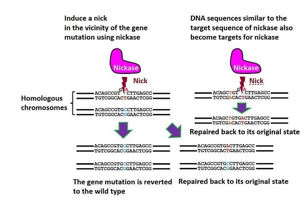 Schéma metody editování genů NICER. Zářez je vytvořen v blízkosti mutace (a týká se výhradně mutované alely). Pouhé zavedení zářezu v blízkosti mutace podněcuje homologní rekombinaci mezi homologními chromozomy, ale s velmi nízkou rychlostí. Pokud se však provede jeden nebo dva další zářezy do obou alel, účinnost genové korekce prostřednictvím homologní rekombinace mezi homologickým chromozomy se výrazně zvýší. Kredit: S. Nakada