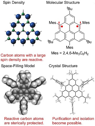 Až dosud se o existenci triangulenu v krystalické formě dalo mluvit jen za velmi nízkých teplot, molekula totiž ihned podléhala polymeraci. Tomu nyní chemici z Osaka University, Osaka City University a dalších vědeckých institucí zabránili tím, že citlivá místa „přikryli“ chránícími skupinami (opět viz obrázek). Takže vlastně už jde stejně jen o derivát triangulenu, nicméně z hlediska magnetických vlastností to nevadí.
