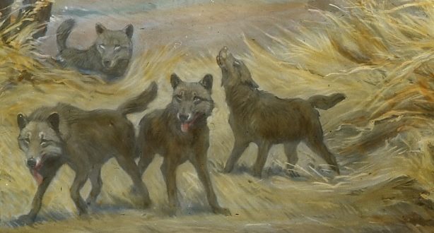 Pravlk obrovský Canis dirus, ilustrace Charles R. Knight, výřez (1922 - nemusí přesně odpovídat moderním rekonstrukcím). Licence obrázku public domain