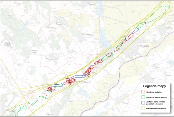 Tornádo výrazně zasáhlo obce Hrušky, Moravskou Novou Ves, Mikulčice, Lužice, severní části Hodonína a Ratíškovice (obr. 1). Na základě leteckého i pozemního průzkumu a následné konzultace mezi odborníky nad získanými materiály o způsobeném poškození byla tornádu přiřazena kategorie F4. Kromě rozsáhlých škod na majetku, vegetaci a infrastruktuře si bohužel tornádo vyžádalo 6 obětí a přibližně 200 zraněných osob.