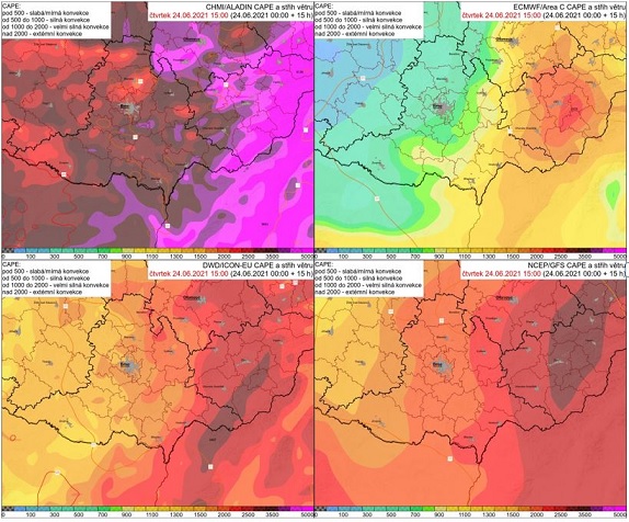 Pro ukázku byl vybrán termín předpovědi ze čtvrtku 24. 6., 15 UTC (17 hodin místního času), což časově odpovídá rozvoji vzniklých supercel na území Rakouska a České republiky. Vybrané zdroje dat ze 4 modelů poukazují na obecnou prostorovou shodu vysokých hodnot těchto parametrů, nicméně na území o velikosti několika krajů, což v podrobnějším měřítku značí větší prostorovou nejistotu předpovědi výskytu konkrétních nebezpečných jevů. Extrémní projevy bouřek se většinou vyskytují na velmi malém území, tj. přesné určení jejich výskytu není možné a nebylo možné ani v případě výskytu tornáda.