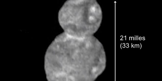 Planetka Ultima Thule, nově oficiálně Arrokoth. Snímek sondy New Horizont. Obrázek. NASA. Licence obrázku: volné dílo.