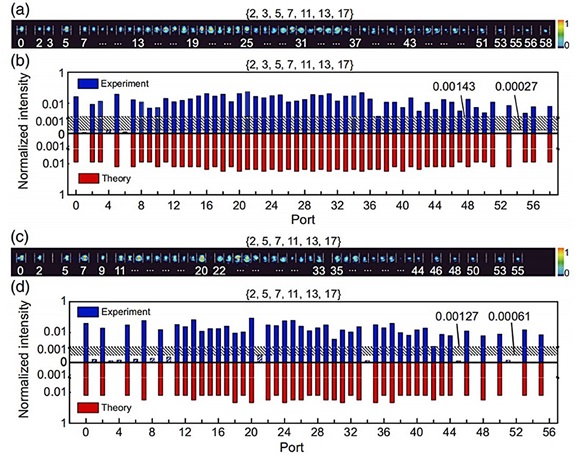 Výsledky výpočtů instancí SSP, kde je množina {2, 3, 5, 7, 11, 13, 17} a {2, 5, 7, 11, 13, 17}. (a) a (c) Experimentální odečet se zobrazí jako řada skvrn, které potvrzují existenci příslušných součtů podmnožiny (tj. čísel pod skvrnami). (b) a (d) Experimentální a teoretické rozložení intenzity. V teoretických případech nenulová intenzita potvrzuje existenci součtu podmnožiny. Použitím přiměřeného prahu intenzity lze experimentální signály správně klasifikovat na platné (za prahem) a neplatné (pod prahem). Toleranční intervaly prahových hodnot jsou vyznačeny černými pásy. Kredit: Advanced Photonics (2024). DOI: 10.1117/1.AP.6.5.056011