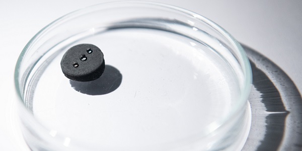 Porézní grafenový aerogel plující na vodní hladině v Petriho misce. Aerogel má výrazně nižší hustotu než voda, ale to není pravý důvod, proč pluje, protože jakákoliv jiná porézní látka (pěna, houba) by se naplnila vodou a klesla pod hladinu. Hydrofobní vlastnosti aerogelu materiálu zabraňují jeho zaplnění vodou a následnému potopení. Téměř dokonalé kulové kapky vody na vrchní části potvrzují jeho superhydrofobicitu. FOTO: René Volfík, FZÚ