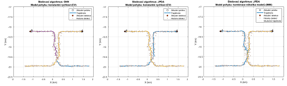 Ukázkovým příkladem může být sledování trajektorie dvou přibližujících se objektů. Úkolem je určit, kterým směrem budou jednotlivé objekty pokračovat. V závislosti na použitém algoritmu můžeme dosáhnout několika výsledků (obrázek 3). Pokud se objekty přiblíží příliš blízko, mohou být detekce přiřazeny jediné trajektorii, protože si sledovací algoritmus „myslí“, že se jedná o jeden objekt. Tím dojde ke ztrátě informace o druhém objektu a při oddělení trajektorií je založena trajektorie nová. Takový výsledek může podat jednodušší sledovací algoritmus, například trackerGNN (global nearest-neighbor). Pokročilejší algoritmy, jako jsou trackerJPDA nebo trackerTOMHT, jsou většinou přesnější, ale za cenu vyšší výpočetní náročnosti. Chování sledovacího algoritmu také významně ovlivňuje volba vnitřního modelu předpokládaného pohybu objektu. Lze zvolit konkrétní model pohybu (například konstantní rychlost – CV) nebo algoritmus přepínající různé modely (IMM). Volba vhodného sledovacího algoritmu musí odpovídat požadované přesnosti, dostupnému výpočetnímu výkonu a předpokladům, jaké situace mohou v reálném prostředí nastat.
