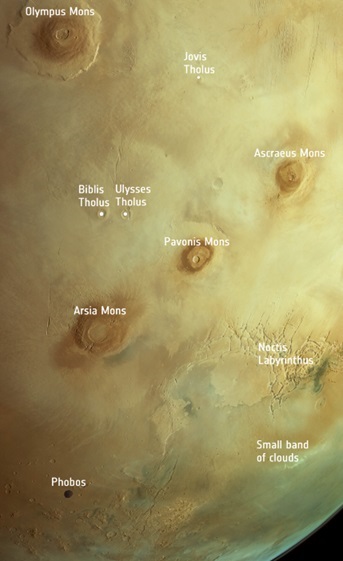 Nový snímek byl získaný pomocí přístroje HRSC (High Resolution Stereo Camera) na palubě sondy Mars Express. Je na něm vidět mnoho sopek planety Mars a dokonce je na něm vidět i největší měsíc planety, Phobos.
