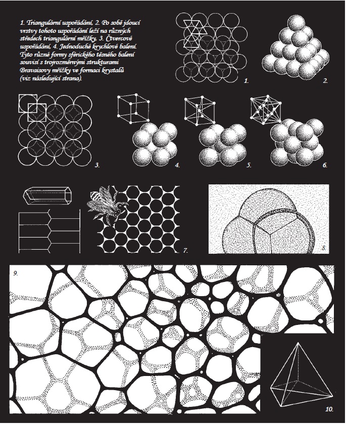Dojde-li však na větší shluky mýdlových bublin, spojují se už pod zcela jiným magickým úhlem, a to 109° 28’ 16’’. V jakékoli pěně nebo elastické pryži (9) se vnitřní povrchy spojují právě v tomto úhlu – je to přesně ten, který utvoří přímka vedoucí ze středu do rohu čtyřstěnu (10). Je zajímavé, že čtyřstěn jako těleso samo o sobě nevyplní prostor úplně, ačkoli v kombinaci s osmistěnem ano.