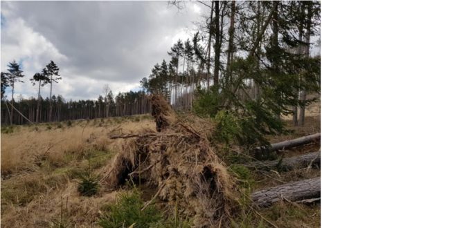 tak ve směru postupu jižní části supercely do oblasti posledního pozorování tromby v okolí Horního Štěpánova. V pondělí 3. 4. byla prozkoumána oblast od silnice mezi obcemi Petrov a Rudka po údolí řeky Svitavy jižně od Letovic. První náznaky škod byly pozorovány na mýtině severně od obce Rudka. Kromě čerstvě vyvrácených stromů se zde vyskytovaly vývraty očividně staršího data, které by byly zavádějící pro závěry učiněné pouze na základě leteckého průzkumu. K odlišení starších a nových vývratů a polomů bylo třeba posoudit čerstvost vytrženého kořenového systému nebo i vlhkost vyzdvižené půdy. Pro odlišení škod způsobených tornádem a přímočarým větrem bylo důležité posoudit i směr padlých kmenů. Na mýtině a v okolí bylo vyvráceno jen pár solitérních borovic a bříza, přičemž půda byla poměrně mokrá. Směr jejich vývratu odpovídal rotaci víru, který právě zde mohl zesílit a působit první škody. Následně se podél dráhy tornáda skrze smrkový a borovicový les směrem k východu objevovaly četnější vývraty a polomy – z velké části již zpracované či odklizené místní lesní správou. Přibližně po 700 m se dráha přiblížila k silnici mezi Rudkou a Nýrovem, kde stromy padlé přes silnici musely být odstraněny jednotkou HZS (nahlášená událost v čase 18:21 SELČ).