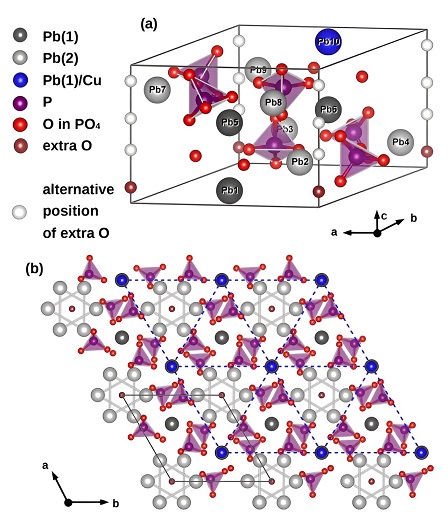 Krystalová struktura LK-99 neboli Pb9Cu(PO4)6O: (a) jedna jednotková buňka při pohledu zboku; (b) čtyři jednotkové buňky a okolní atomy při pohledu shora. Existuje určitá nejistota ohledně polohy jednoho atomu kyslíku a ohledně toho, na kterém místě je namísto olova měď. Kredit: arXiv (2023). DOI: 10.48550/arxiv.2308.00676