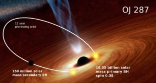 V centrech většiny galaxií se nacházejí superhmotné černé díry s hmotností řádově miliard Sluncí. Astronomové je pozorují jako jasná galaktická jádra (kvasary/blazary), kde supermasivní černá díra pohlcuje hmotu z víru kolem obíhající hmoty (akreční disk). Galaktické jádro jasně září v prakticky celém elektromagnetickém spektru a produkuje i intenzivní výtrysky hmotných …