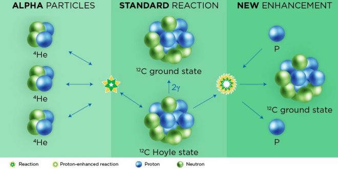 Reakce 3 alfa je v normálních hvězdách ale poměrně neefektivní (viz u obrázku). Jak praví nová studie, uvnitř supernov však funguje další podpůrný proces, který způsobuje, že se vznikající excitovaný atom uhlíku s menší pravděpodobností rozpadá zpět a s větší se přeměňuje na finální uhlík. Za „posun rovnováhy“ této reakce směrem k uhlíku mohou volné protony existující (nejen) v povrchových vrstvách supernovy.