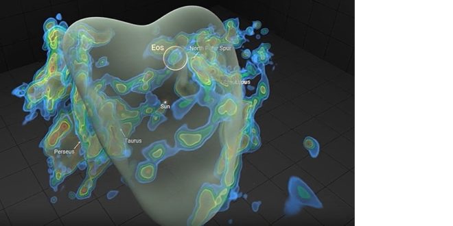 Plynný oblak ve tvaru půlměsíce se nachází asi 300 světelných let od Země na okraji Místní bubliny, velké dutiny ve vesmíru vyplněné plynem, která zahrnuje i Sluneční soustavu. Vědci odhadují, že Eos je obrovský (v projekci na oblohu asi 40 Měsíců) a má hmotnost asi 3 400krát větší než Slunce. Podle modelů by měl existovat ještě tak 6 milionů let, pak se zřejmě „vypaří“.