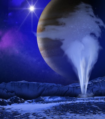 Výtrysk vody na povrchy Europy, umělecká představa. Credit: NASA/ESA/K. Retherford/SWRI