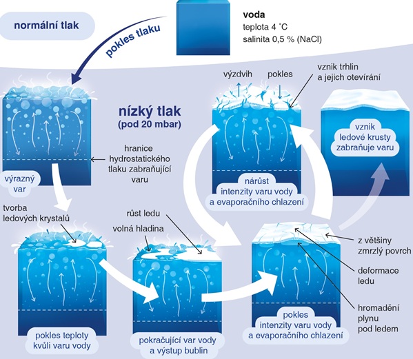„Zjistili jsme, že proces tuhnutí vody v prostředí s velmi nízkým tlakem je složitější, než se dosud předpokládalo,“ říká hlavní autor studie Petr Brož. „Za nízkého tlaku voda vře i při nízkých teplotách, protože není za daných podmínek v kapalném stavu stabilní. Její vypařování přitom způsobuje, že rychle chladne a následně mrzne. Ledová krusta, která se tvoří na její hladině, je ale opakovaně narušována bublinami vodní páry vznikající v důsledku jejího varu. Bubliny led nadzvedávají a lámou, čímž se celý proces mrznutí zpomaluje, komplikuje a výrazně prodlužuje,“ vysvětluje vědec.