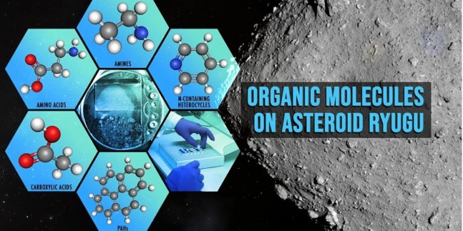 Podle souboru chemických analýz vzorku z povrchu asteroidu Ryugu, který na Zemi dopravila japonská sonda Hayabusa2, obsahuje asteroid velké množství různých organických molekul, kvalitativně i kvantitativně. Výsledky podporují teorii, že organický materiál z vesmíru přinesený kometami přispěl k pozemské prebiotické chemii – řada sloučenin se na Zem dostala už předsyntetizovaných předem, nemusela zde vznikat znovu.
