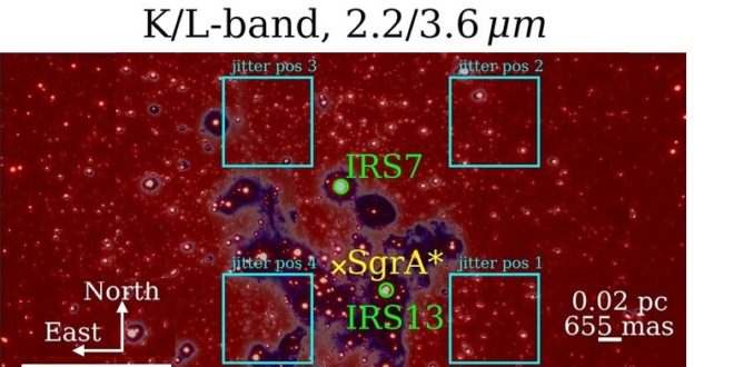 Infračervený snímek vnitřní oblasti našeho galaktického centra získaný v pásmech K a L zhotovený pomocí infračervené kamery (NACO detektoru) umístněné na velmi velkém dalekohledu (VLT – Very Large Telescope) v Evropské jižní observatoři, Chile. Hvězdokupa IRS13 je označena zeleně. Čtyři čtverce označují pointační oblasti pro spektroskopická pozorování vesmírným teleskopem Jamese Webba. Autor: F. Peissker et al.