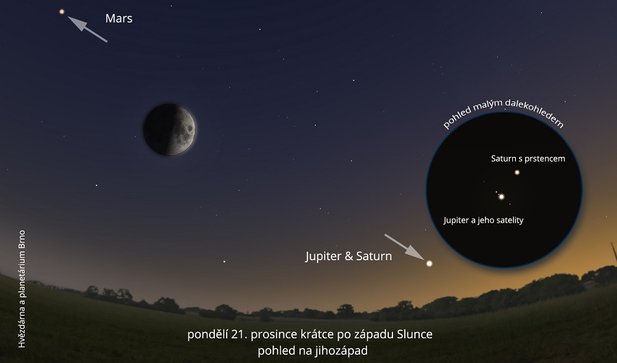 Po celý prosinec můžeme hned po západu Slunce, nízko nad jihozápadním obzorem, sledovat dva nápadné zářící body – obří plynné planety Jupiter a Saturn, přičemž první jmenovaná je z onoho páru tou jasnější. Den za dnem se k sobě zvolna přibližují a to až do pondělí 21. prosince, kdy téměř splynou v jednu „hvězdu“. Něco podobného se naposledy událo v roce 1623 a znovu se zopakuje až za šedesát let!