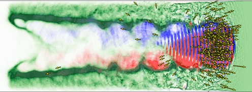 Superpočítačová simulace emise energetického záření gama (žluté šipky) hustým plazmatem (zelená), vytvořeným laserovým paprskem o vysoké intenzitě (červená a modrá). Laser se šíří zleva doprava, přičemž emitované fotony letí stejným směrem. Nekontrastní modré a červené oblasti představují silné magnetické pole generované plazmatem, zatímco oblast oscilací odpovídá magnetickému poli laseru.