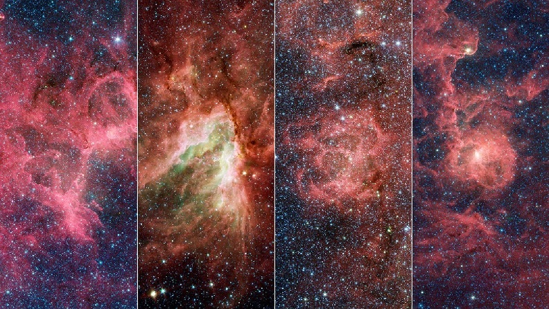 (Zleva) Orlí mlhovina, mlhovina Omega, Trifid a Laguna na snímcích (infračervených) z dalekohledu NASA Spitzer. Credit: NASA/JPL-Caltech