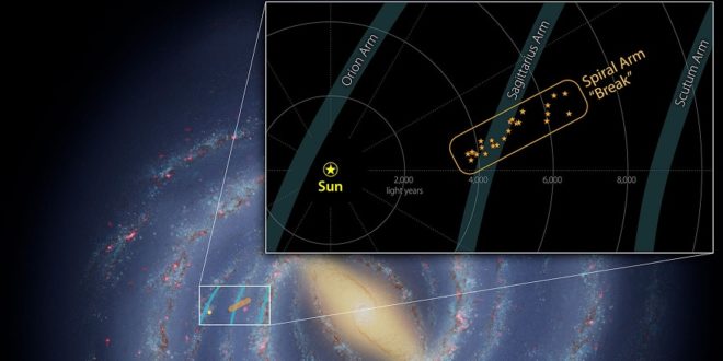 Astronomové objevili dosud kupodivu neznámý rys Mléčné dráhy: Z jednoho ze spirálních ramen naší Galaxie vyčnívá jako tříska ze dřeva velká skupina mladých hvězd a hvězdotvorných plynných mračen. Jedná se strukturu, která se táhne asi 3 000 světelných let a její orientace je zcela odlišná od orientace ramene jako celku.