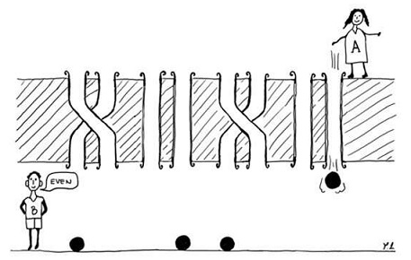 Jak ukazuje obrázek, před sebou máme štěrbiny, respektive kanály. Některé z dvojic jsou v oddělující zdi překřížené. Na jednom konci systému se nachází Alice, na druhém Bob. Jejich cílem je zjistit, jak celé propojení vypadá, a to s použitím co nejmenšího množství částic/pokusů. Jak na to? Oba se např. dohodnou, že Alice hodí kuličku vždycky do pravé trubky z každého páru. Z toho, kde kulička vypadne, se zjistí, kolik/které páry trubek jsou rovné a které se ve zdi kříží. V klasické světě nelze získat úplnou informaci („vyhrát hru“) s použitím méně kuliček, než je párů trubek.